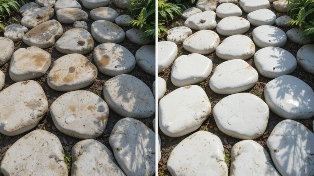 Pedras brancas de jardim: É inevitável: com o tempo, as pedras brancas do jardim perdem o brilho e ficam encardidas. A chuva, poeira, folhas secas e até a urina de animais podem comprometer o visual limpo e elegante do seu espaço externo. Mas calma! Você não precisa trocar tudo. É possível recuperar o brilho das pedras brancas sem danificá-las — e com soluções simples e seguras.